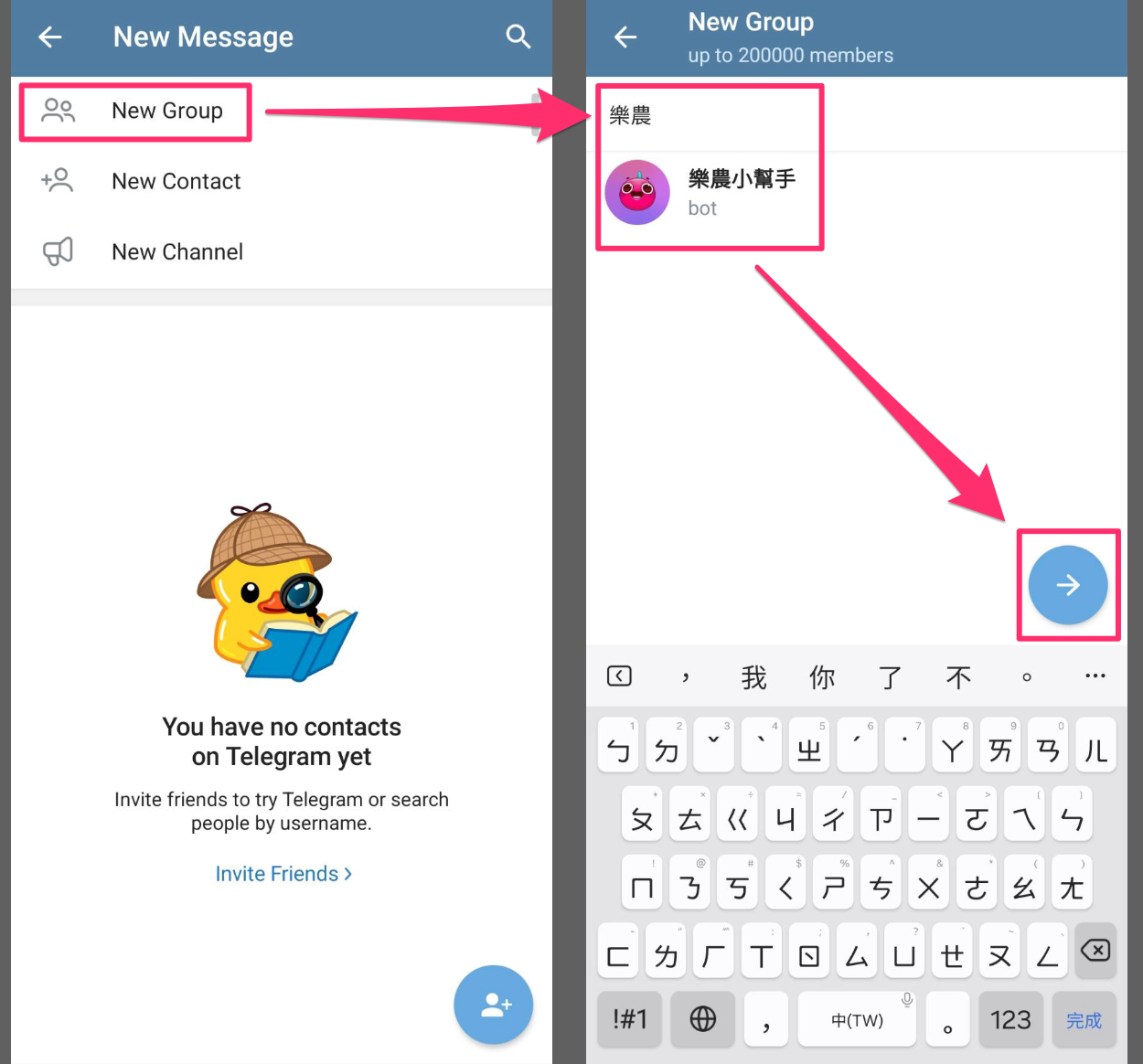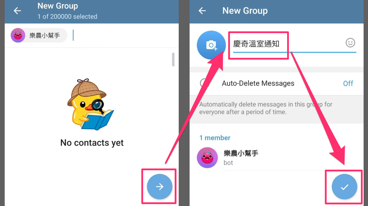 點選「New Group」建立新群組。在搜尋框輸入通知機器人名稱,找到後點選加入,並點選「→」進行下一步。