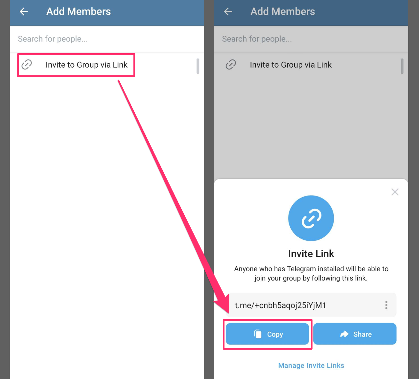 點選「 Invite to Group via Link 」-> 「Copy」獲得分享連結。