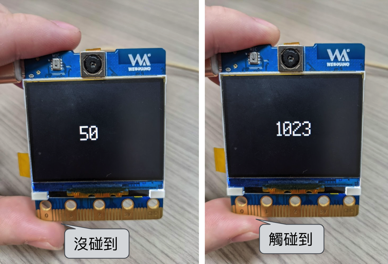 - 程式內容:用手觸碰類比腳 ( pin4 ),就可以看到螢幕顯示數值上升到 1023。