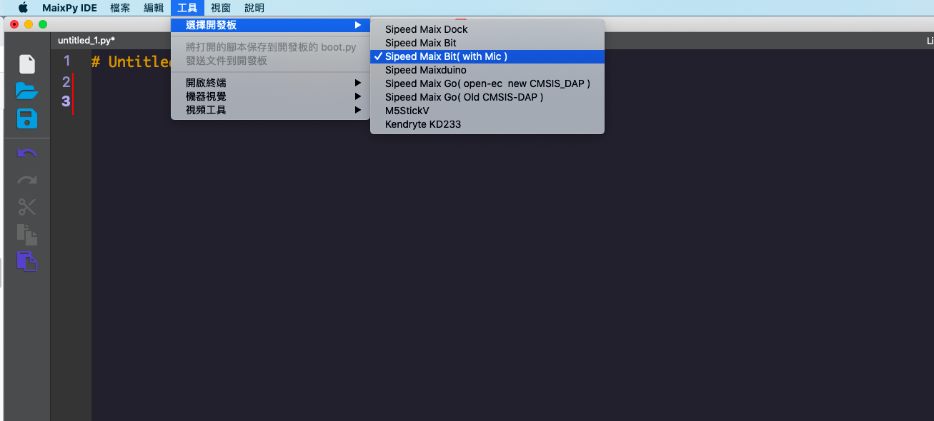 點擊上方「工具」>「選擇開發板」>「Sipeed Maix Bit ( with Mic )」,代表選擇控制 Web:AI 開發板。
