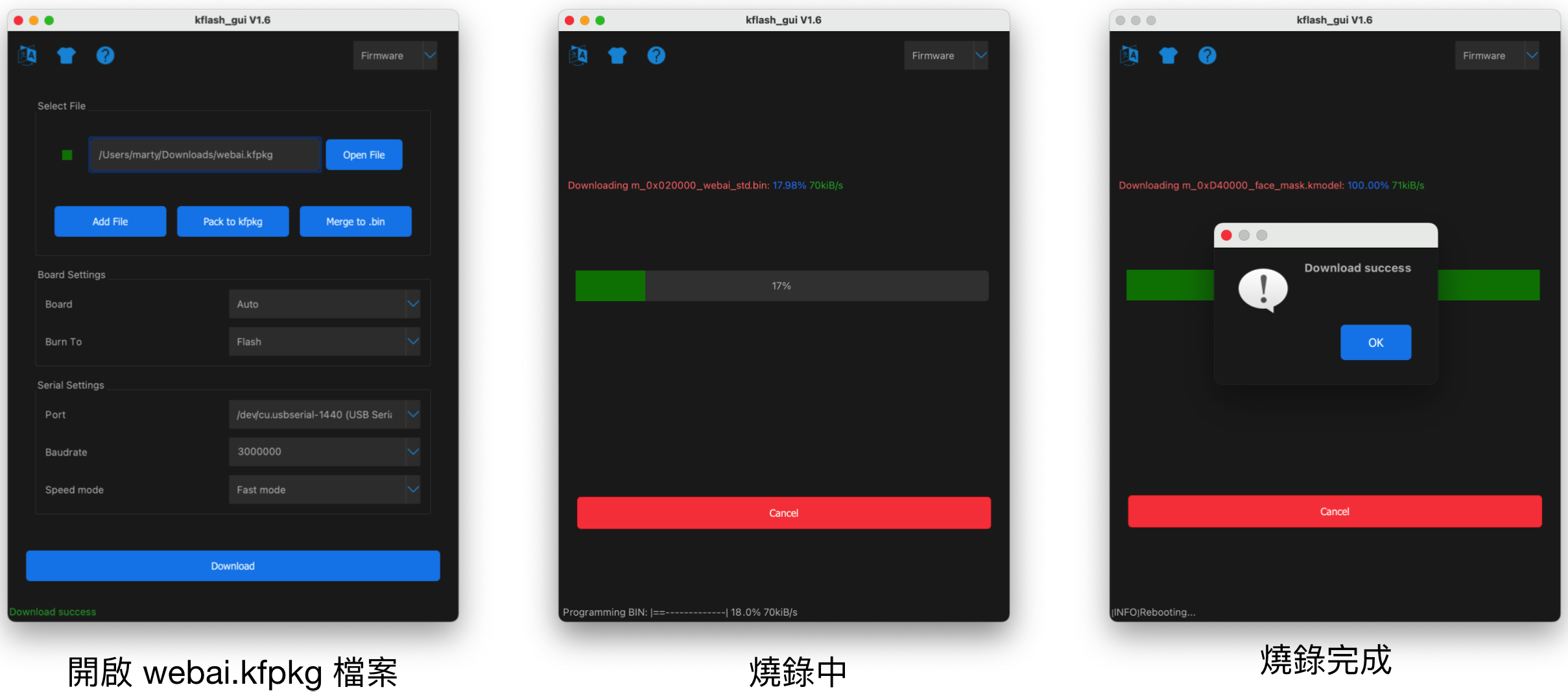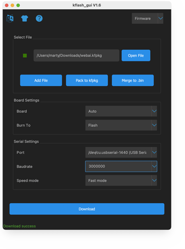 2. 下載 [kflash_gui](https://github.com/sipeed/kflash_gui/releases/tag/v1.6.7),點擊執行,開啟 webai.kfpkg 韌體檔,等待下載完畢後就燒錄完成了。