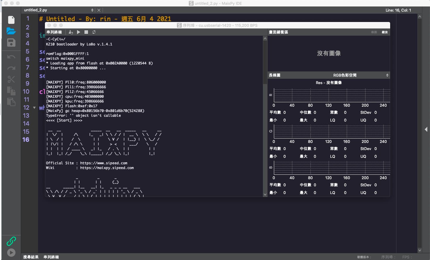 點擊 [MaixPy IDE](https://drive.google.com/drive/u/0/folders/1AhEgANgd8PxQOlZgmxWc8JhbpstaIXDS) 下載,安裝後開啟 MaixPy IDE 應用程式,進入開發環境畫面。